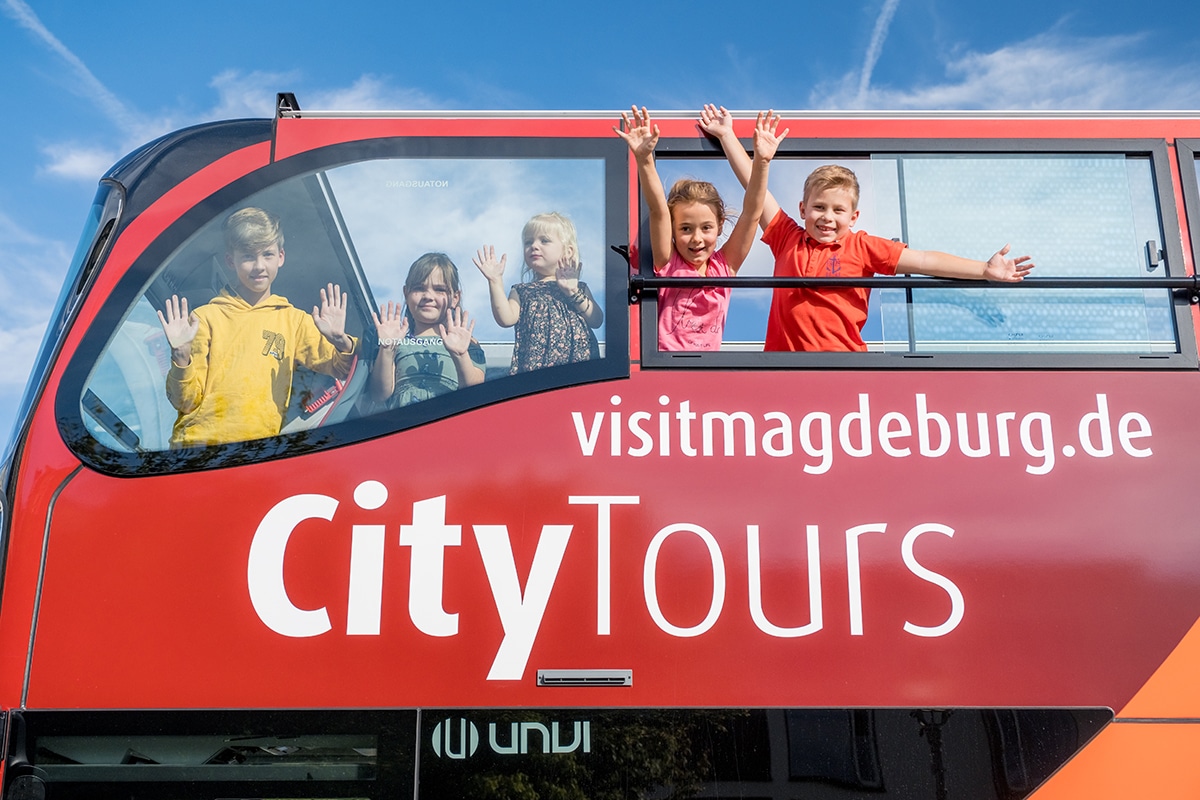 If you want to learn much more exciting background information about Magdeburg, you should not miss a city tour in the big red double-decker bus. From April to October, up to four times a day, a one-hour round trip with the best view leads through the historic cathedral district, along the green banks of the Elbe to the Elbauenpark with the extraordinary millennium tower. Via audio guide, you can learn all kinds of surprising anecdotes from 1,200 years of Magdeburg. There is even an extra Magdeburg radio play for all young passengers.