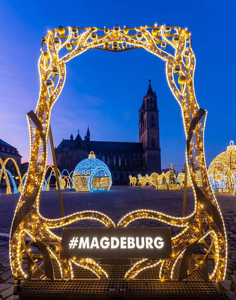 Magdeburg is a unique destination in many respects. Here is a very special tip: Throughout the winter, the city is transformed into an extraordinary sea of lights. More than 1.2 million lights and hundreds of kilometers of fairy lights immerse the city in a winter wonderland. Larger-than-life light sculptures line the streets and squares. The Magdeburg Virgin glitters on her city gate, the Magdeburg Horseman sits enthroned on his golden shining horse and fountains are entwined with light steles.